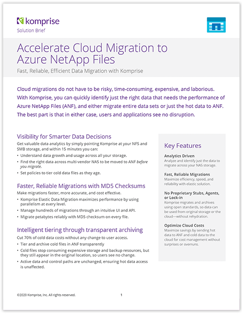Komprise Elastic Data Migration makes cloud data migrations simple, fast and reliable. It eliminates sunk costs with continual data visibility and optimization even after the migration. Migrating on-premises applications such as file workloads, high-performance computing (HPC) and analytics requires identifying and migrating tens of terabytes to several petabytes of file data stored on NAS appliances and other on-premises storage to the right tier of Azure Files, Azure NetApp Files and Azure Blob Storage.