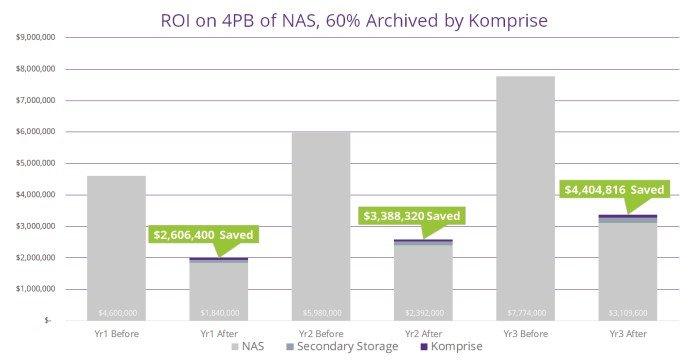 Based on the average costs from the cost metrics above, on a 4PB NAS environment with a 30% year-over-year growth rate, Komprise saves customers an average 57% of overall storage costs and over $2.6M+ annually.